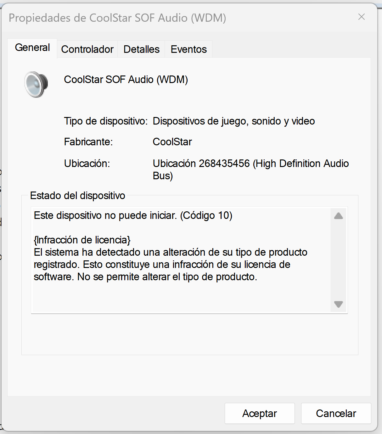 The driver cannot be started because the system indicates an error (code 10) and flags a license violation: “The system has detected an alteration to your registered product type.”