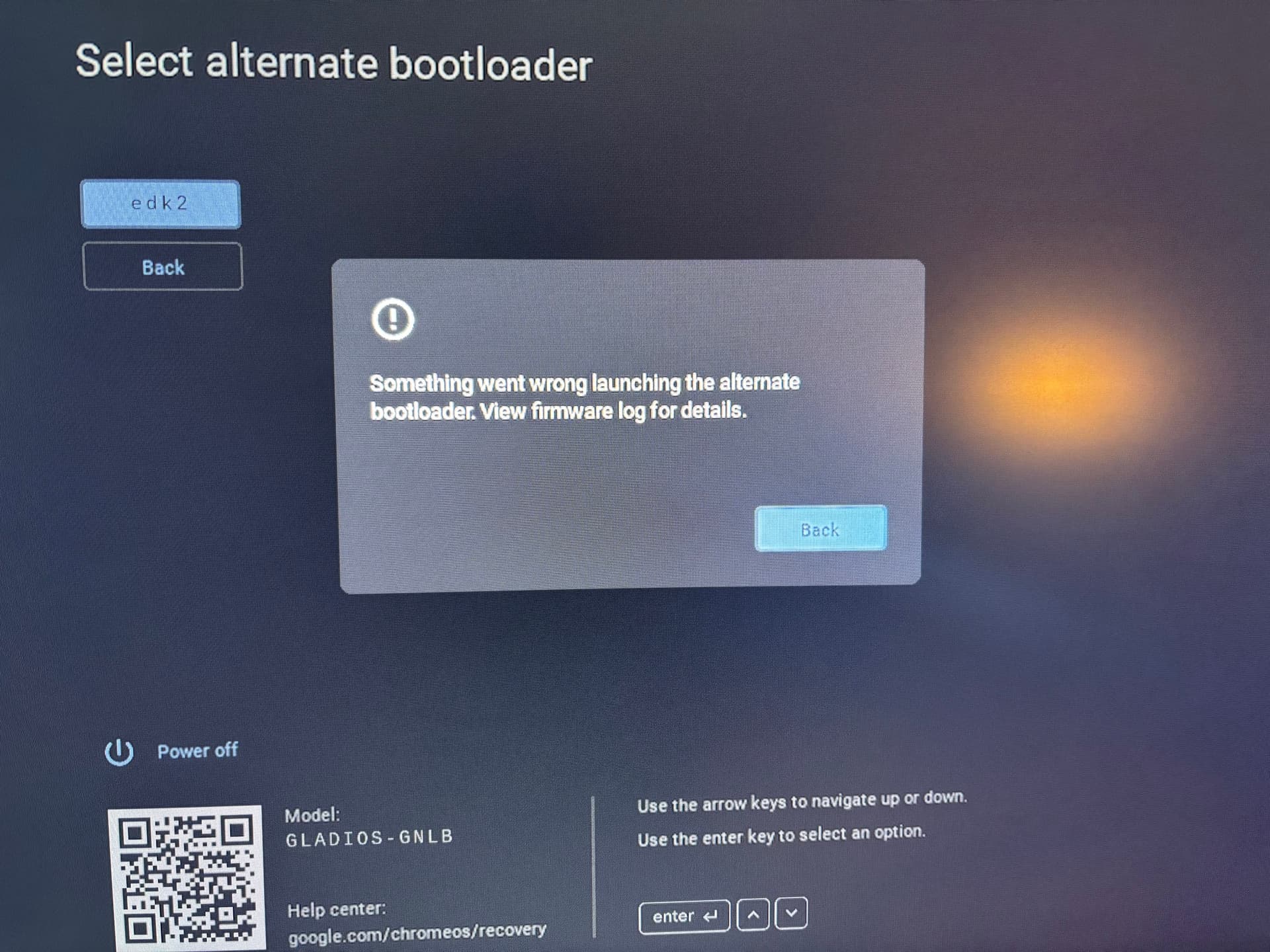 Initially, I wanted to install the UEFI full ROM, however, when running that part of the script, I received the error: “The script does not currently have a firmware file for your device (GLADIOS); cannot continue.” According to the supported devices on the MrChromebox site, I should be able to use the full ROM firmware.