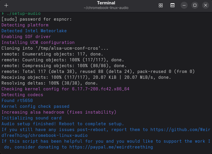 I am dual booting Chrome OS and Aquamarine Linux 42 on a Acer Chromebook Pro Spin 714. When I run the audio script it says that it worked correctly, but after I reboot the audio still doesn’t work. The only output option is dummy audio and there are no input options. I tried running Zorin OS 18 and Fedora 43, but had the same issues on both of them.