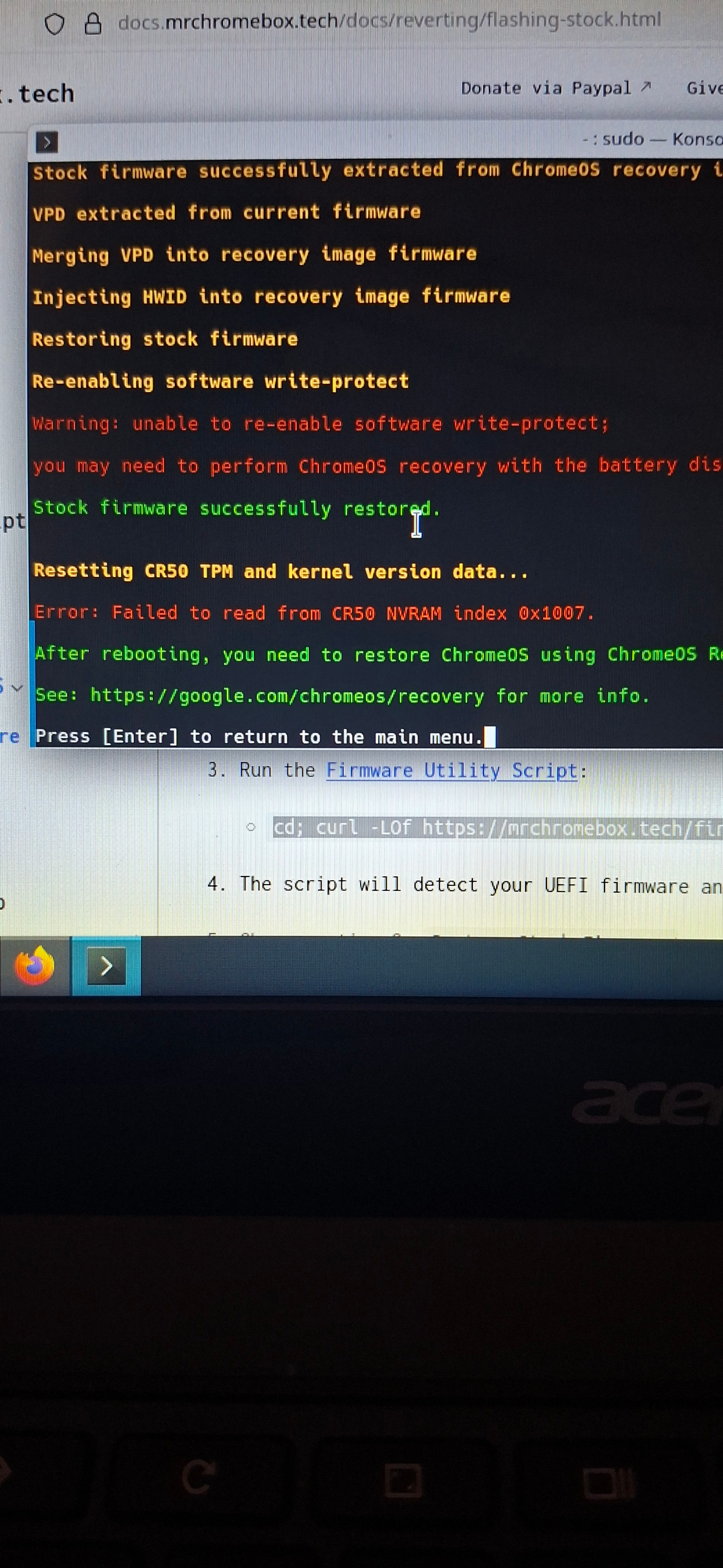 Hello guys I’m attempting to revert back to chrome os form full UEFI mode on my Acer C734T (Maglith). The script ran successfully besides renabling the WP it said I’d possibly need to remove the battery which I’m currently doing and I’m still getting the Something went wrong screen after getting multiple “successful” recovery’s. Do I need to bridge the connections or am I screwed? Any and all help is appreciated.
