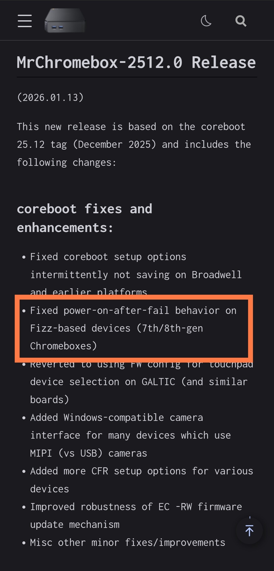 Release note snapshot on MrChromebox’s website: